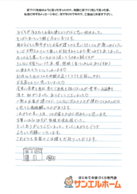 この度は、素敵な「マイホーム」を本当にありがとうございました。「いずれは私達だけのお家が欲しいね」というのが夫婦共通の思いでしたが、こんなに早くそれが実現し、家族一同嬉しいです。