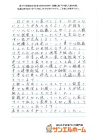 家を持つことは無理だと思っていましたがサンエルホームさんのお力添えで夢を実現できたことを感謝しております。サンエルさんをはじめ多くの方のおかげで家族仲良く楽しい生活を送ることができています。素敵な家を建てていただきありがとうございました。今後ともどうぞ宜しくお願い致します。