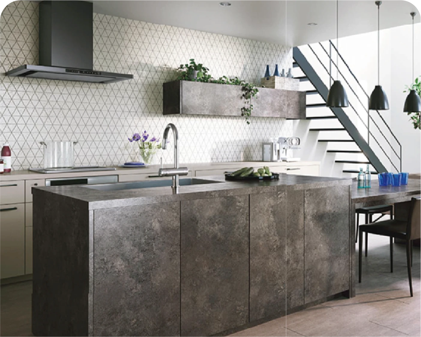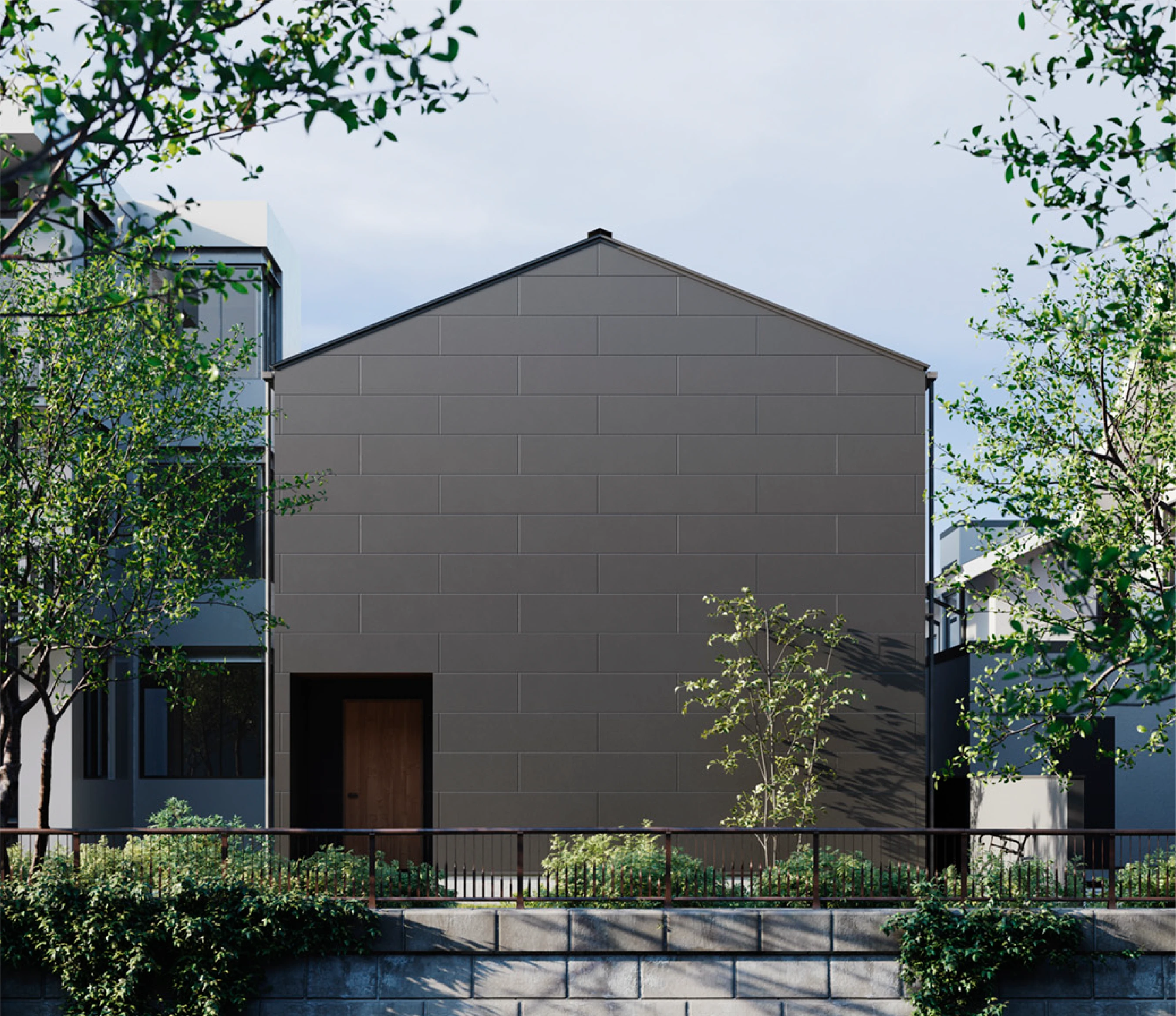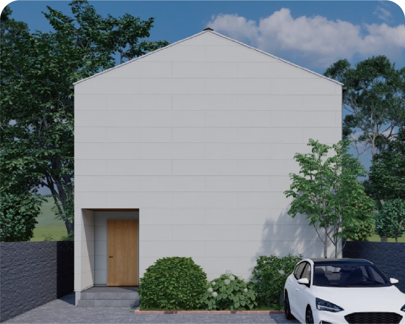 横方向に半分ずつずらす貼り方のことを『馬目地」といいます。由来は馬の足跡のように交互になっているところから。外壁材を「馬目地」張りにすることで、他には見られない特徴のある外観を演出します。