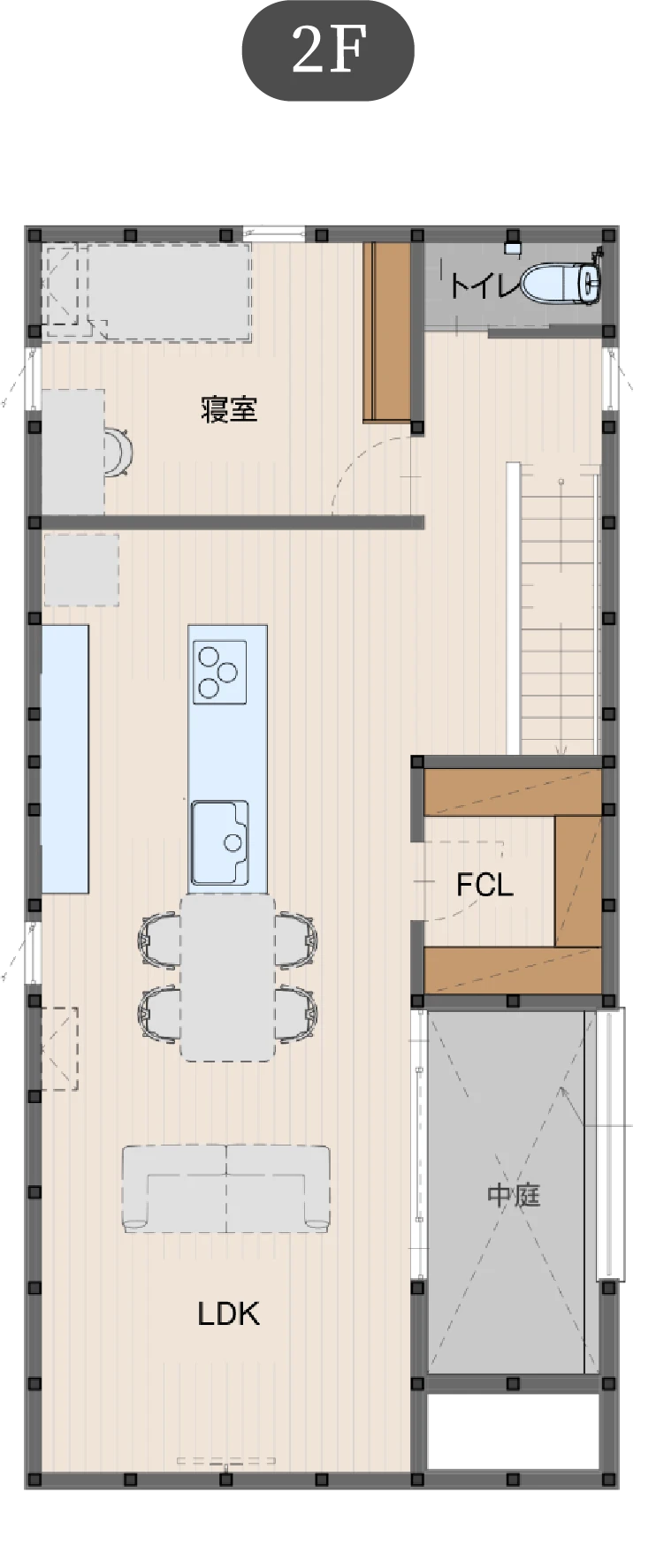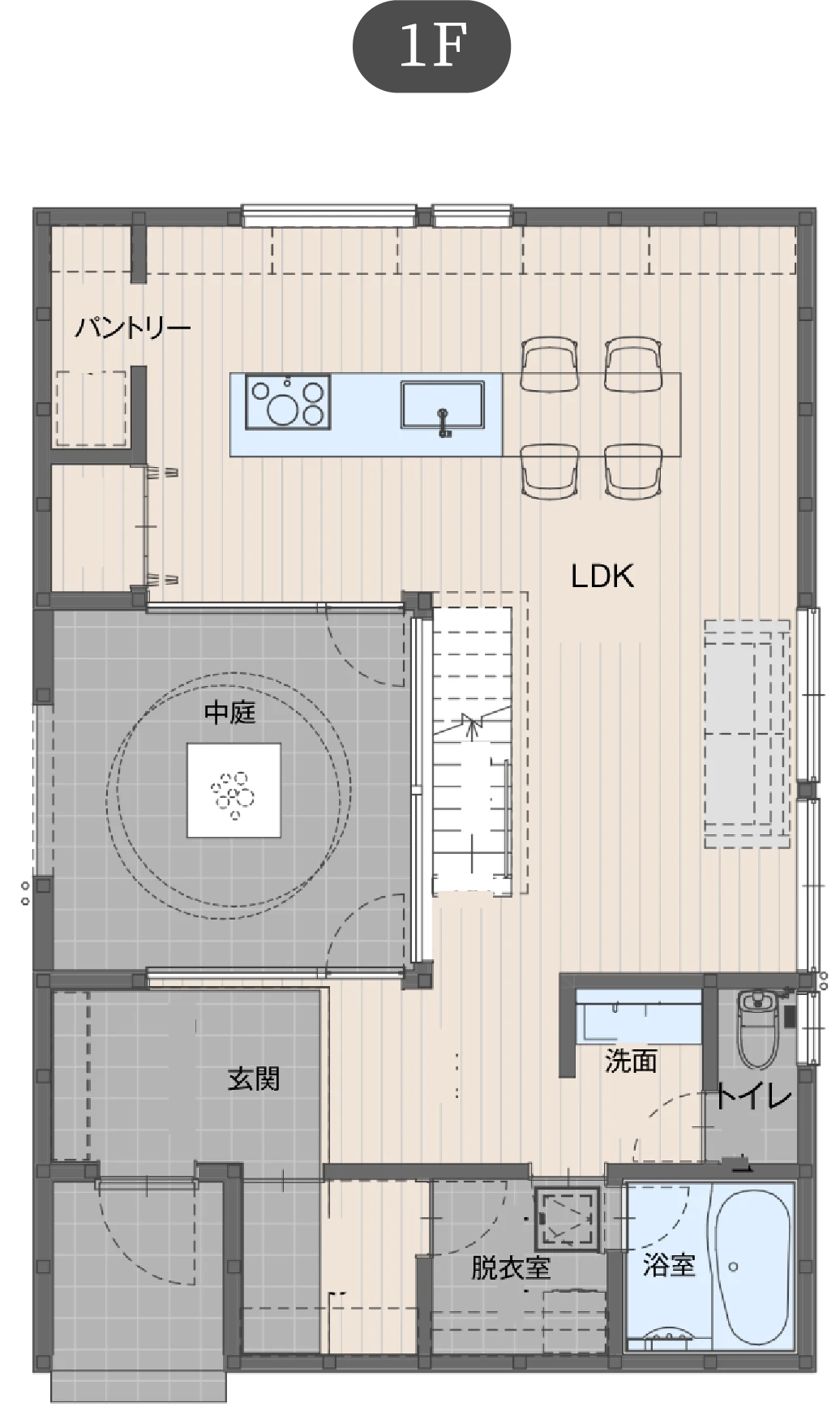 キッチンに立つと家の中心に配置した明るい中庭を通じて、1階はもとより、2階の各部屋までもが見渡せて、家事をしながらでもお子さまの様子を感じ取ることができます。家族の息遣いを感じながら明るく開放的に暮らせる空間になっています。