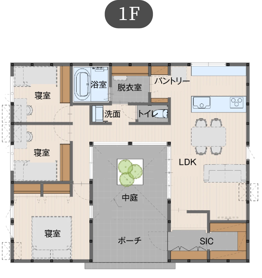 耐震等級とは、地震に対する建物の強さを表す等級のこと。「中庭のある家」は最も耐震性の高い「耐震等級3」を基準としており、震度6強~7の地震でも軽微な補修で住み続けられる耐震性能を確保しています。