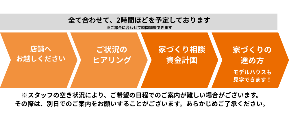 その為、サンエルホームではご来店いただくと、下記の流れで資金計画をご提案しております。
