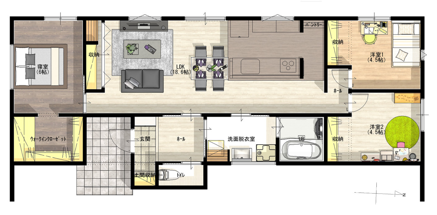 お家の中心となるLDKは18帖の広々設計!自然と家族が集う空間になっています。回遊性のある水まわりなど共働き夫婦が家族時間を楽しむ工夫を各所に設けました!