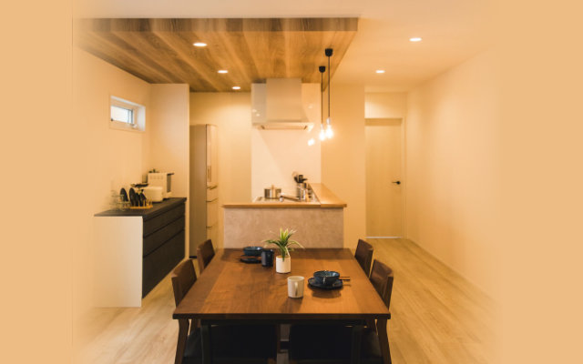キッチンはぐるっと回れるペニンシュラ型。下がり天井&スポットライトでキッチンスタジオのような雰囲気に。ダイニングテーブルも作業台にして、家族みんなで楽しく料理ができます。