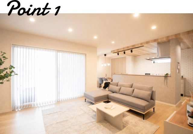 ウッドデッキに繋がる大きな窓のあるLDKには表し梁を設けて更にお洒落広々空間に。玄関から洗面脱衣室、キッチンLDKと、各部屋の家事動線をスッキリさせることで、個々の生活スタイルを大切にしながら、ママの家事楽間取りを実現しました。