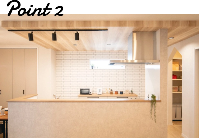 LDKから和室まで全てを見渡せるオープンキッチンは家族みんなで料理を楽しむことのできる広々設計。パントリーや収納を隣接させたことでキッチンをスッキリさせました。