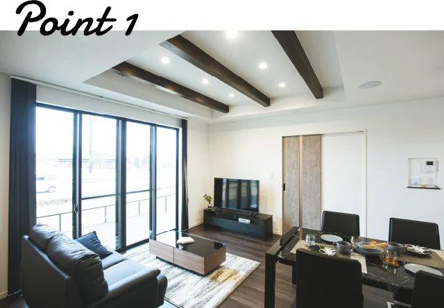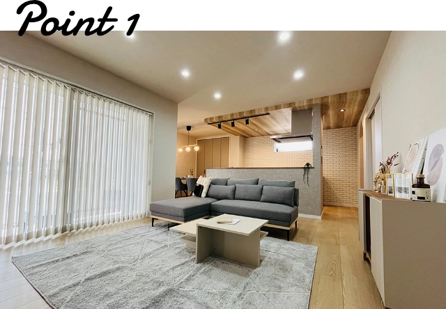 ウッドデッキに繋がる大きな窓のあるLDKには表し梁を設けて更にお洒落広々空間に。玄関から洗面脱衣室、キッチンLDKと、各部屋の家事動線をスッキリさせることで、個々の生活スタイルを大切にしながら、ママの家事楽間取りを実現しました。