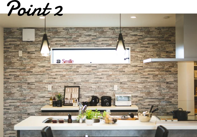 LDKから和室まで全てを見渡せるオープンキッチンは家族みんなで料理を楽しむことのできる広々設計。パントリーや収納を隣接させたことでキッチンをスッキリさせました。