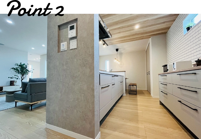 キッチンには人気のペニンシュラスタイルを採用。横並びダイニングで家族時間にも最適です。回遊性のある動線で毎日の家事をラクに楽しく♪