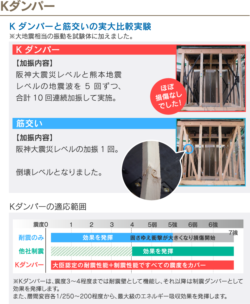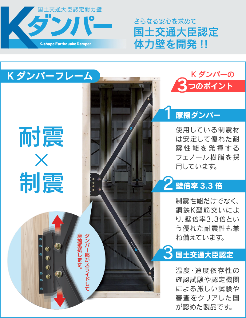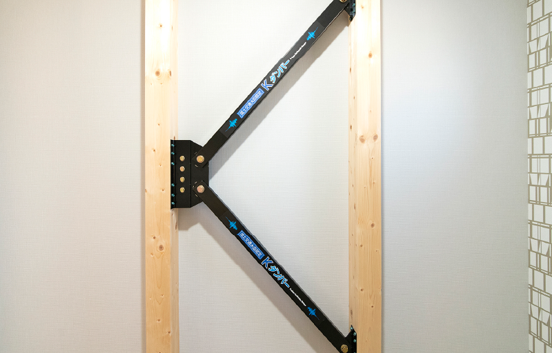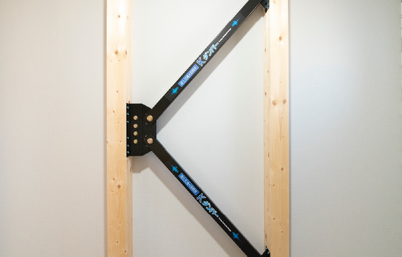 耐力壁の強度をあらわす数値を「壁倍率」といいます。これは0.5~5.0の幅で設定されており、数値が大きくなるほど強度は高くなります。Kダンパーは、その名の通り「鋼製のK型筋交い」を入れることで、壁倍率3.3倍を実現。制震性に加え、優れた耐震性も備えています。