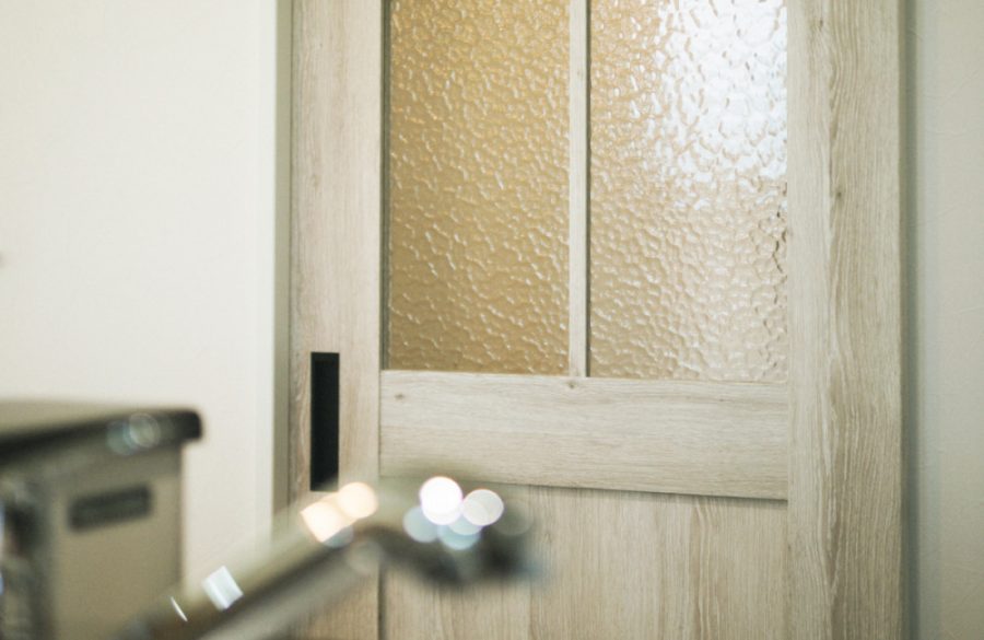 電気をつけていないときにも存在感のあるデザインの照明ですが、電気をつけると不思議なお洒落空間に。夜は影も楽しめる素敵な玄関です。