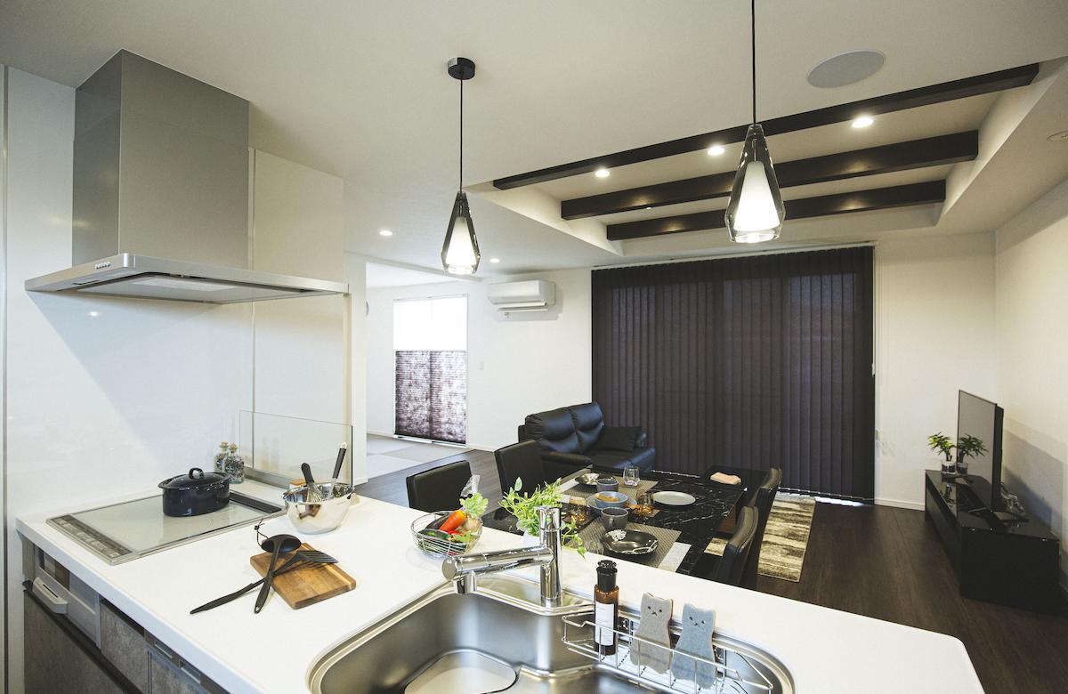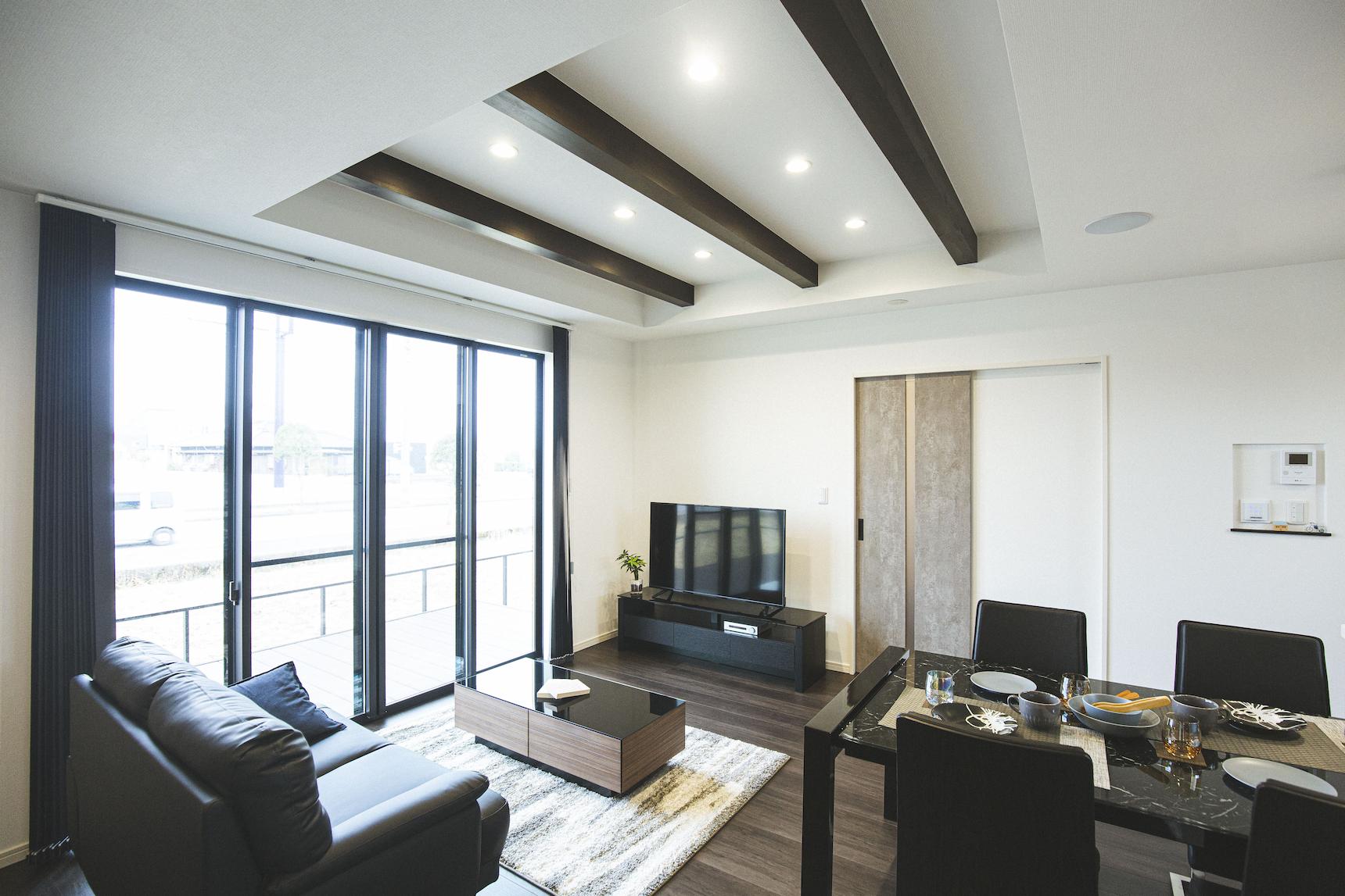 ウッドデッキに繋がる大きな窓のあるLDKには表し梁を設けて更にお洒落広々空間に。玄関から洗面脱衣室、キッチンLDKと、各部屋の家事動線をスッキリさせることで、個々の生活スタイルを大切にしながら、ママの家事楽間取りを実現しました。