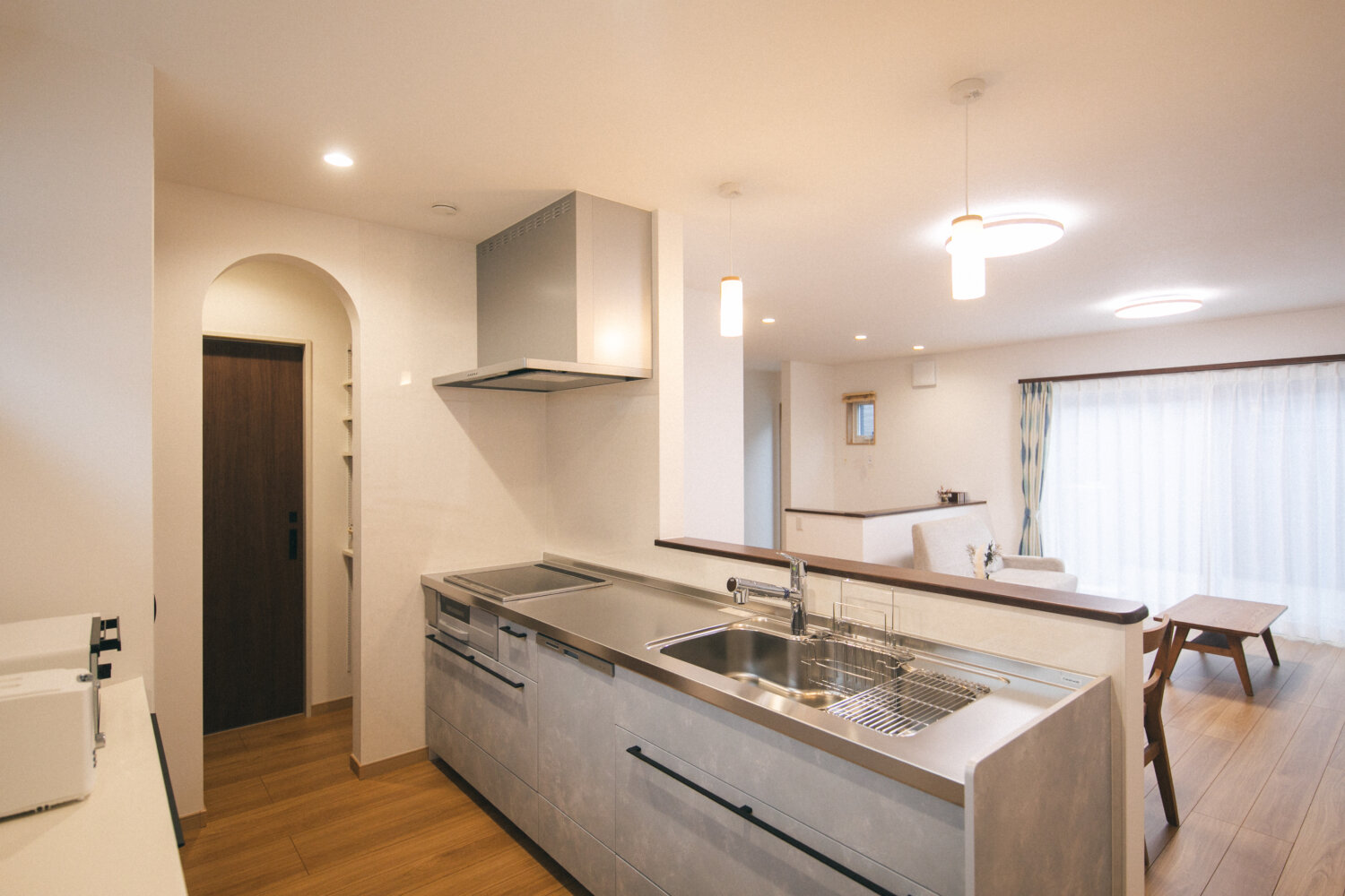 キッチンから洗面・浴室へとつながるスムーズな家事動線。アーチの入り口がデザインのポイントになり、おしゃれな雰囲気を演出。