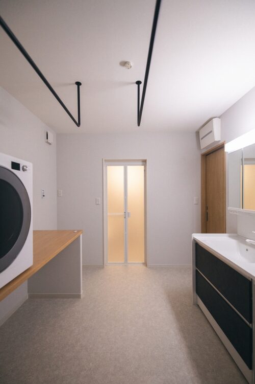 洗面脱衣室には室内干しを設け、隣には大容量のファミリークローゼットを配置しました。
