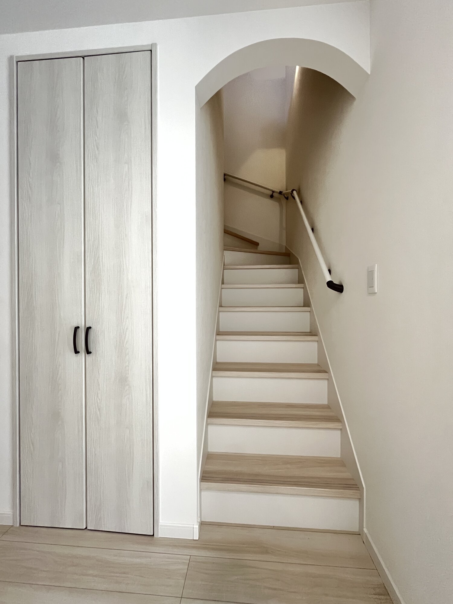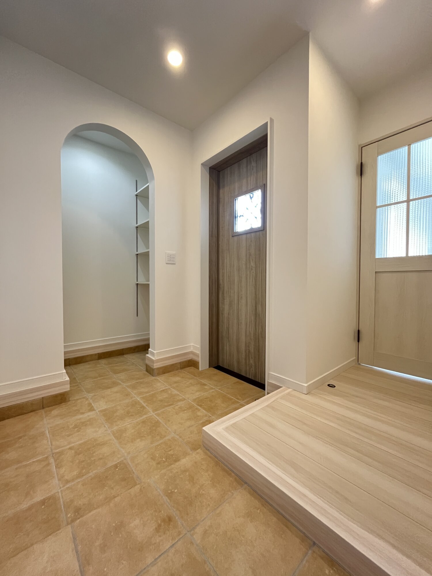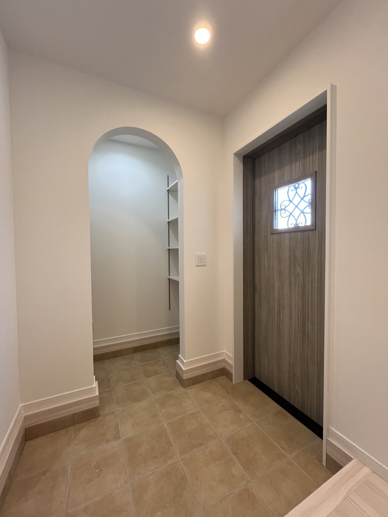玄関横にはアーチ型のシューズクローク。靴やアウトドア用品をたっぷり収納できて、生活感はすっきり隠せるから“見せない美しさ”が叶います。おしゃれと実用性を両立した空間です。