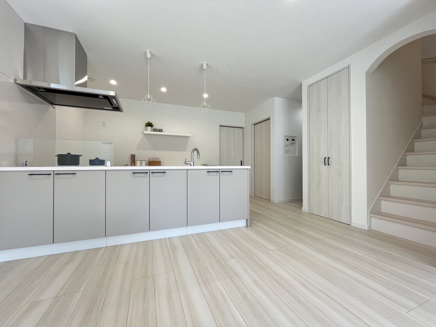 白とグレージュの柔らかなトーンに、ペンダントライトがアクセント。