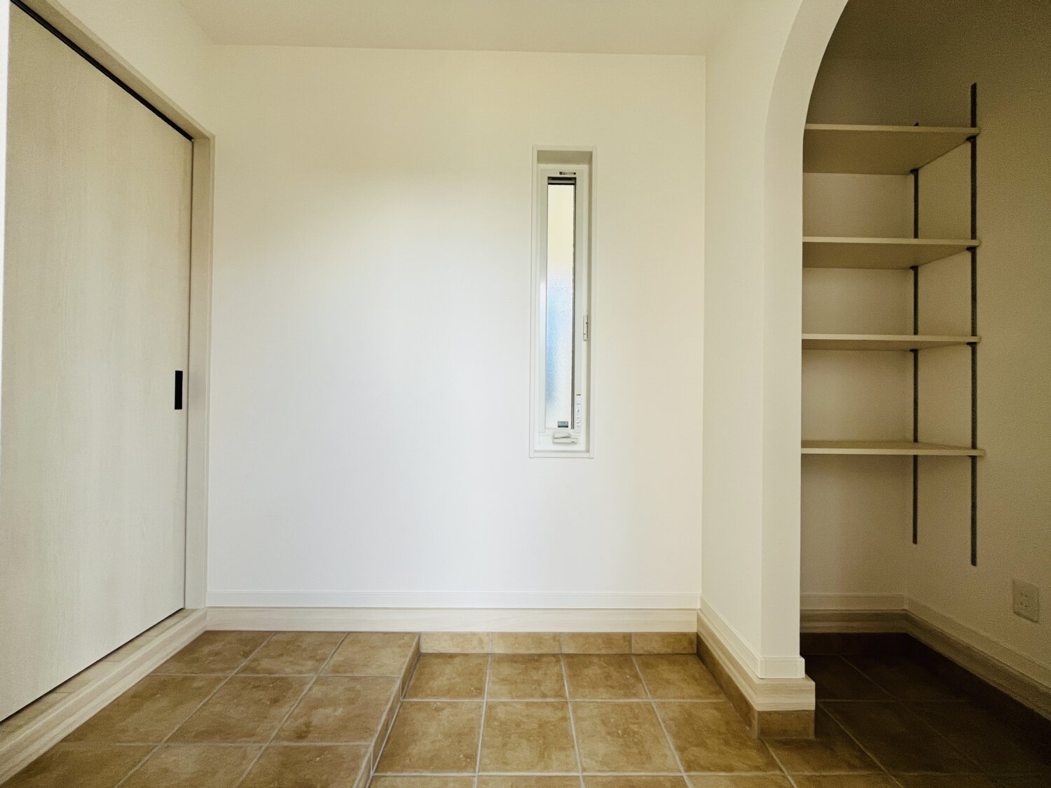入って右手に収納スペースと左手に洋室へと続く扉があります。