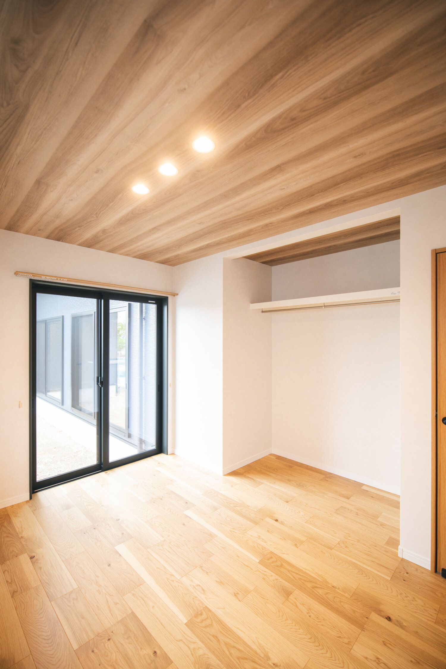 木のぬくもりを感じる明るいLDK。南側の大きな窓からたっぷり光が入り、開放感あふれる空間に。グレーのキッチンと木目天井のコントラストが、空間をスタイリッシュに引き締めます。