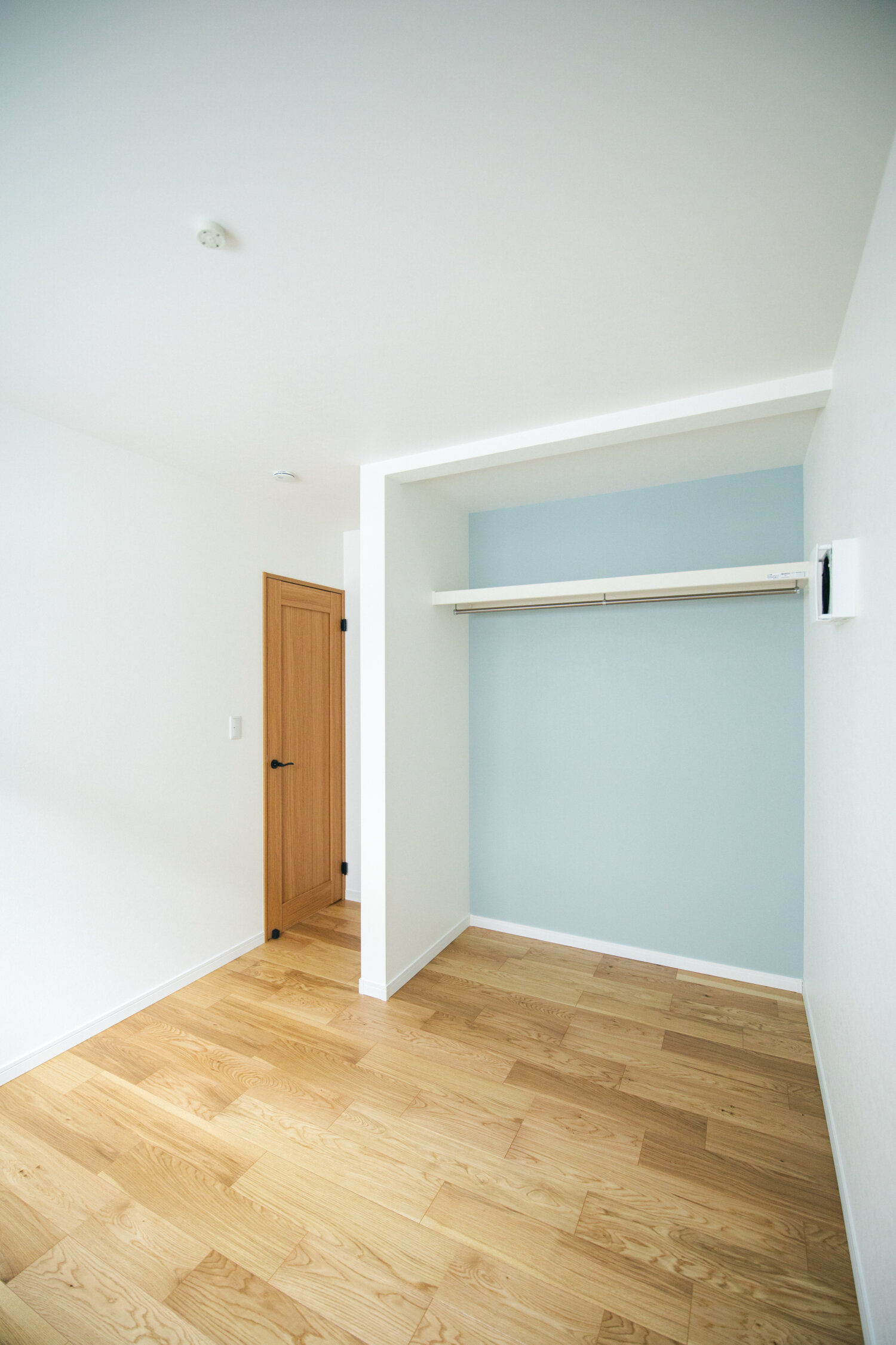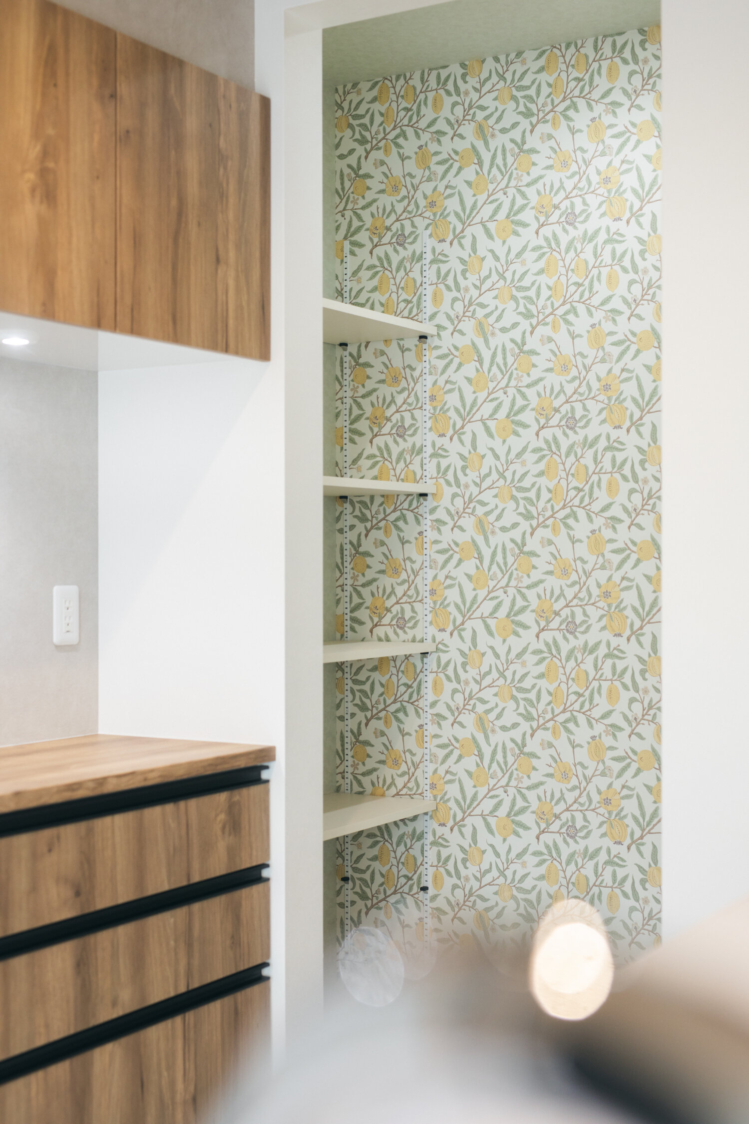 キッチン奥のアクセントクロスは奥様お気に入り。料理中にふと目に入る癒し空間。