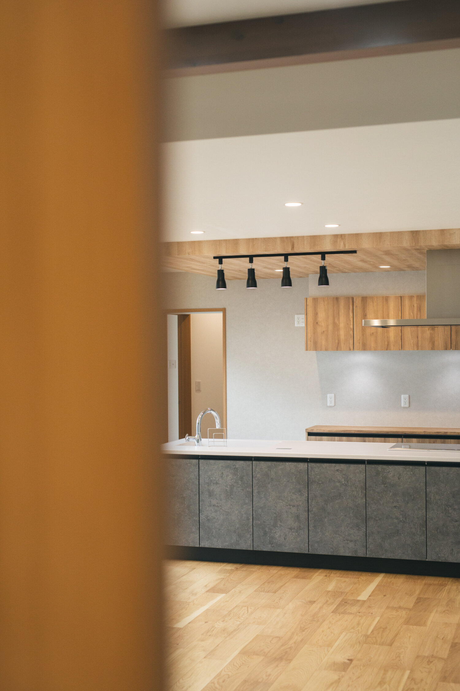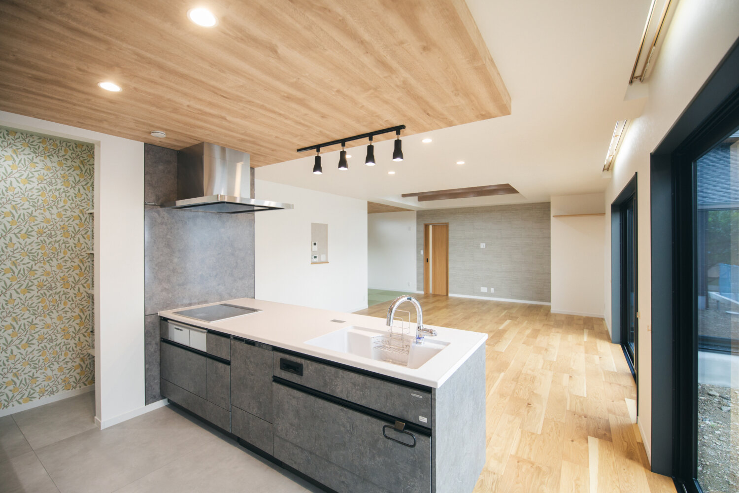 キッチンからリビング全体を見渡せる開放的な間取り。吹抜けのような抜け感と、あたたかみのある木目の天井が心地よい時間をつくります。