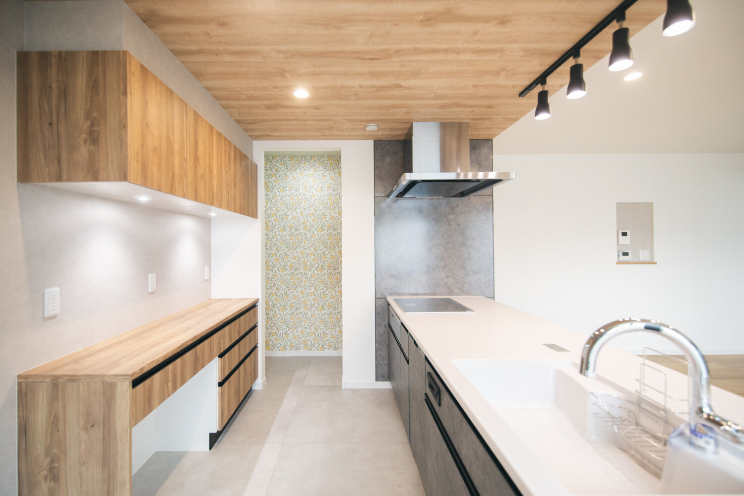 木のぬくもり×グレーの質感が美しいキッチン。奥のアクセントクロスが、日常にちょっとしたときめきを添えます。
