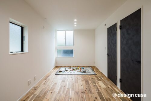 成長に合わせて使い方を変えられるよう、子ども部屋は入口を2つ設置。寝室はグレーで統一し、静かにくつろげる雰囲気を大切にしています。
