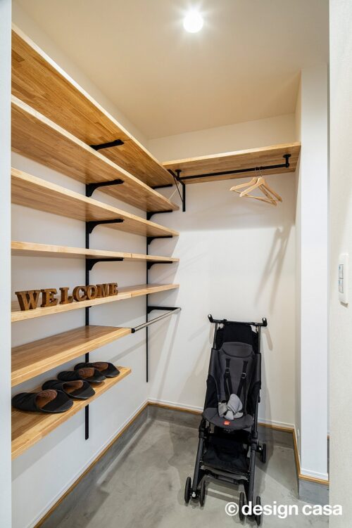 ベビーカーを折りたたむことなく置ける、ゆとりあるシューズクロークを備えました。土間部分にはベンチを設置しており、靴の着脱がしやすいだけでなく、荷物の一時置き場としても活用でき、日常使いに配慮した快適な空間です。