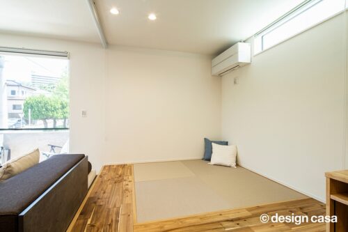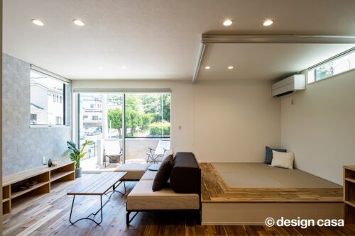リビング内にアップフロアの畳コーナーを設け、多目的に使える空間としました。お子様のくつろぎスペースや遊び場としてはもちろん、来客時には寝室としても対応可能。ロールスクリーンを閉めることで、プライベート感のあるもう一つの部屋に変わります。