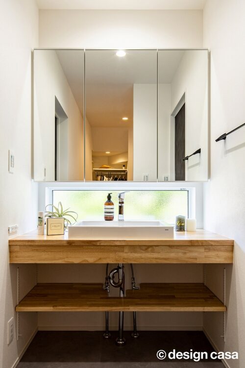 洗面台とミラーの間にFIX窓を設け、光を感じられる爽やかな洗面空間を演出。トイレ部分も同じ素材の棚板を採用し、空間全体のデザインにまとまりを持たせました。