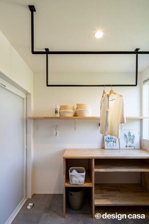 室内干しを配慮した広々脱衣スペース。洗濯物を天井のアイアンバーに干し、取り込んだ後は造作棚の上で畳んですぐに収納という最短の動線を実現しました。