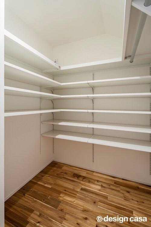 2階にもゆとりあるファミリークローゼットを設けました。1階には日常的に使うアイテム、2階には休日用のものや季節物を収納するなど、使い分けのルールを決めることで、効率的な分散収納を実現しています。