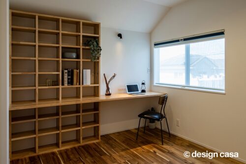 主寝室の一角を活用し、本棚につながるワークコーナーを計画。施主様が希望された漫画本の収納スペースを確保し、好きなものに囲まれて過ごせる書斎スペースを実現しました。