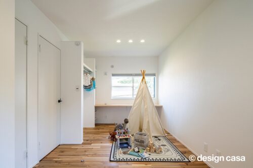 成長に合わせて2室に分けられるよう設計した子ども部屋です。デスクカウンターや可動式の棚、ハンガーラックを初めから設けているため、家具の買い足しを抑えられ、整理しやすい住まいを実現しています。